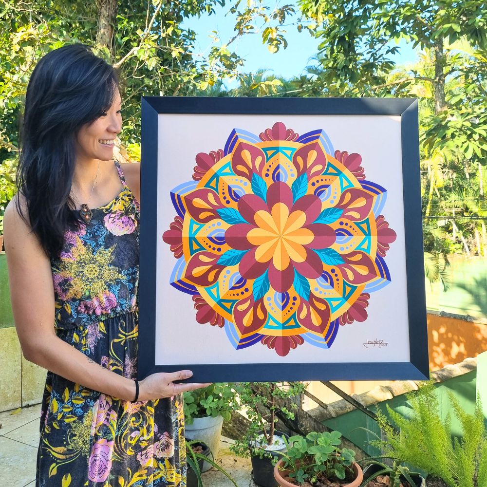 Nesse percurso, aprofundou sua relação com as mandalas, que se tornaram seu principal canal criativo. Por meio das formas, cores e símbolos, encontrou uma forma de autoconhecimento e presença, traduzindo emoções e experiências em composições que convidam ao acolhimento e à reconexão.